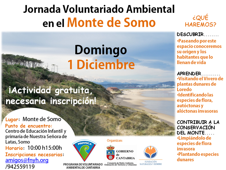 Este domingo 1 nueva propuesta de voluntariado organizada por Fundación Naturaleza y Hombre (FNYH) en el marco del Programa de Educación y Voluntariado Ambiental de Cantabria, PROVOCA, promovido por la Consejería de Medioambiente, Ordenación del Territorio y Urbanismo del Gobierno de Cantabria. La jornada es gratuita y sólo requiere inscripción previa.