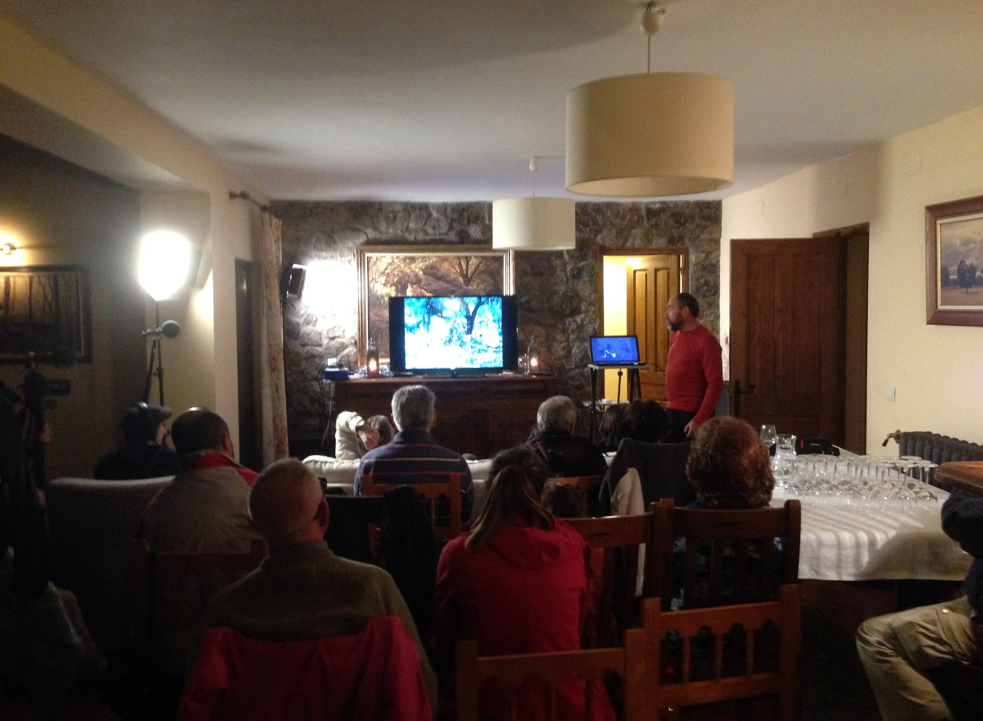 La tarde estuvo destinada a acoger a los antiguos miembros de la Asociación Naturalista SENA, integrada en la Asociación Cultural de Amigos de Ciudad Rodrigo. Con un agradable paseo invernal por Campanarios de Azaba se realizó un encuentro familiar con amigos de la naturaleza del Oeste Ibérico. Culminó al caer la tarde en el lodge ubicado en el corazón de la finca, donde se realizaron dos charlas fascinantes: “Leones en África”, impartida por Roberto Sánchez, y “Jaguares en Sudamérica”, por Chele Martínez, que deleitaron a mayores y pequeños.